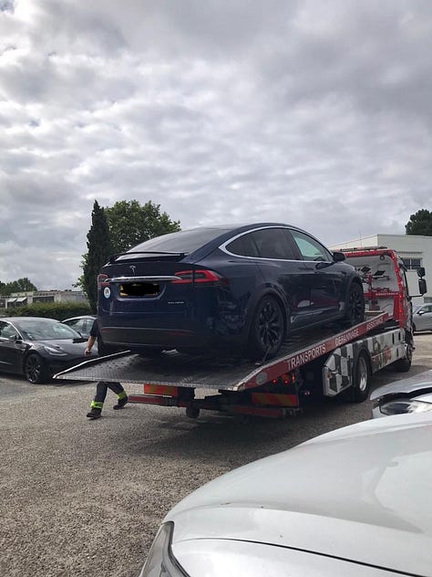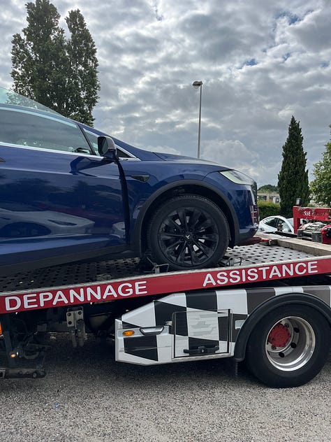 My wonderful wife was able to establish that the door was still secure and just about lockable. She was also able to get the Notaires to hold back €5,000 from the seller until the front door was replaced. She also managed, with the estate agents help with the language, to organise a removal for me in the Tesla to Bordeaux (their nearest service centre). After two hours a truck appeared next to me. I removed one or two items of value (my computer and some whisky) from the car, before I watched it disappear off to Bordeaux. The removal chap basically left me at the side of the road sitting on a couple of packing boxes awaiting rescue by Paula.